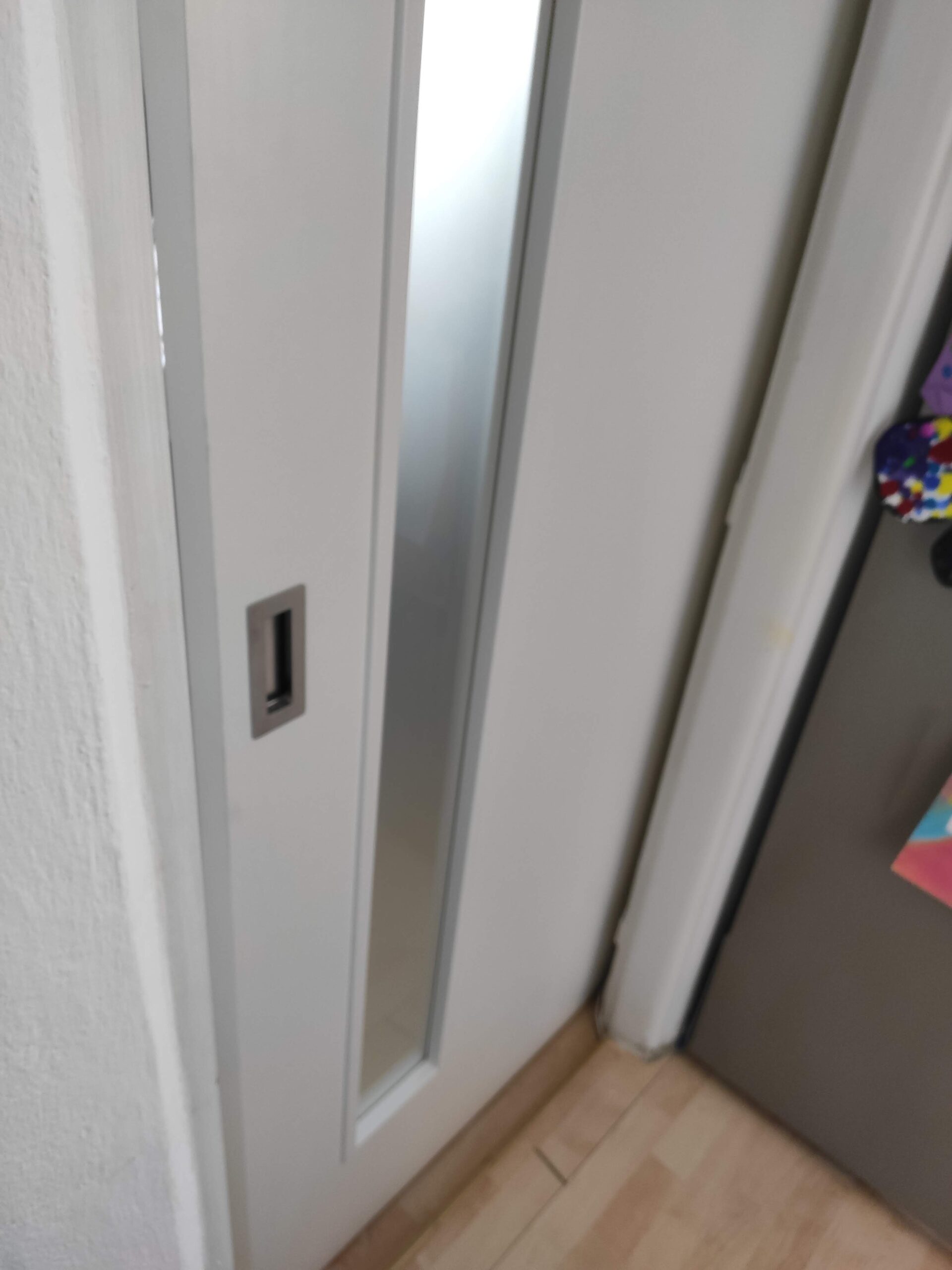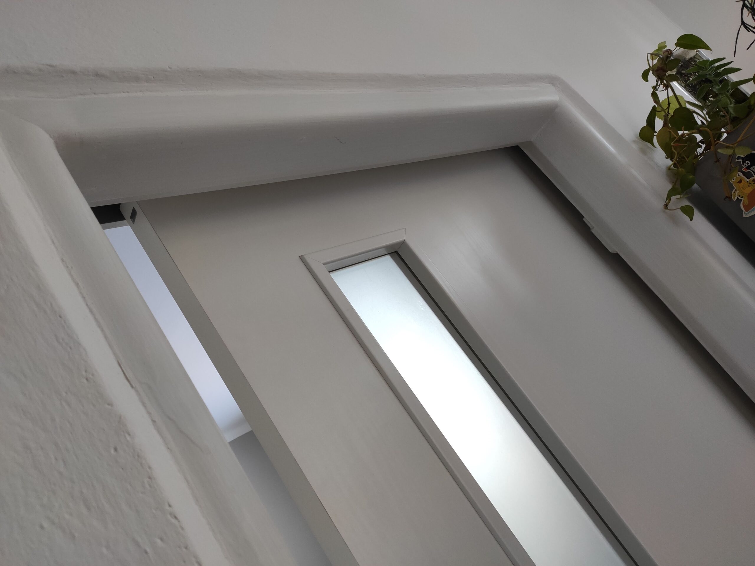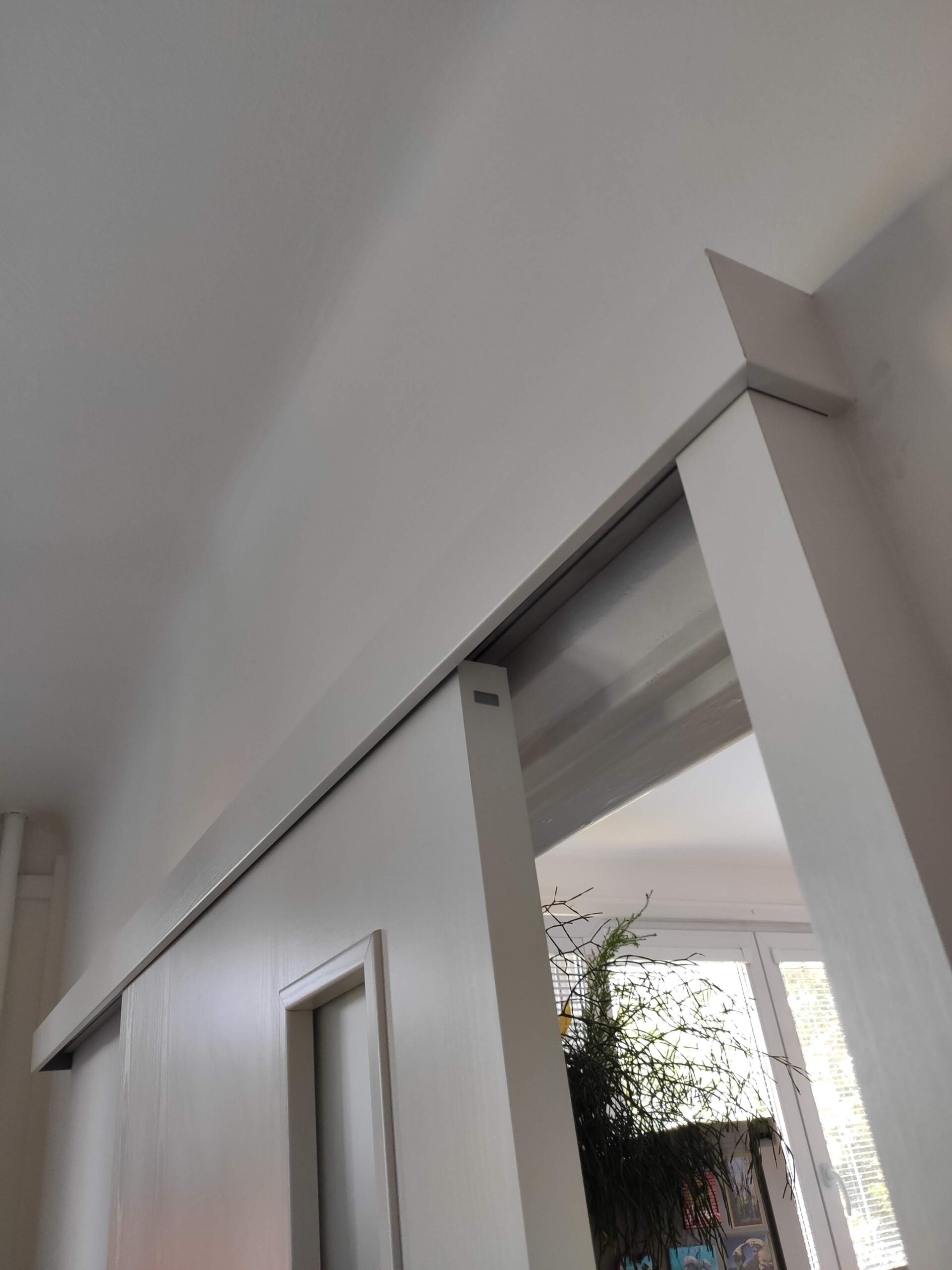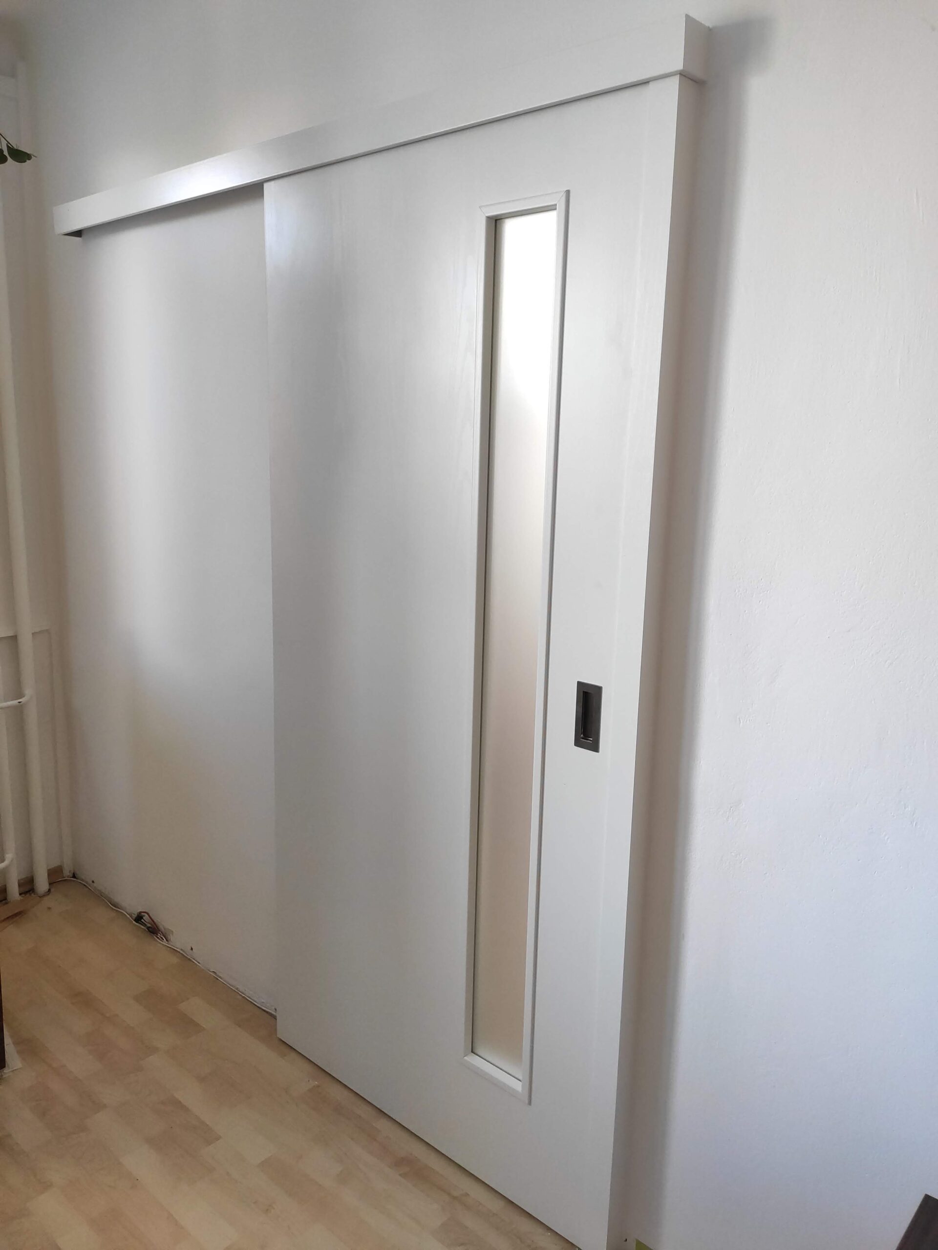 Posuvné dveře na stěnu se sloupkem. Zákazník si přál zanechat původní kovovou zárubeň.