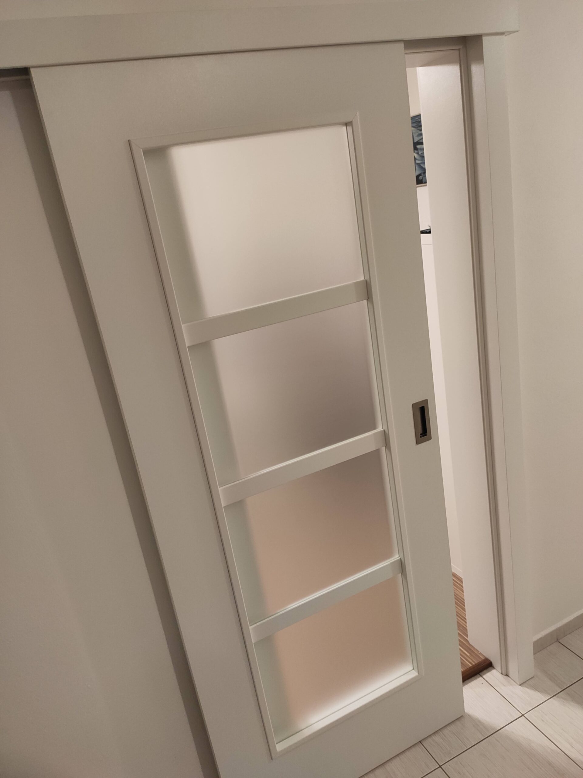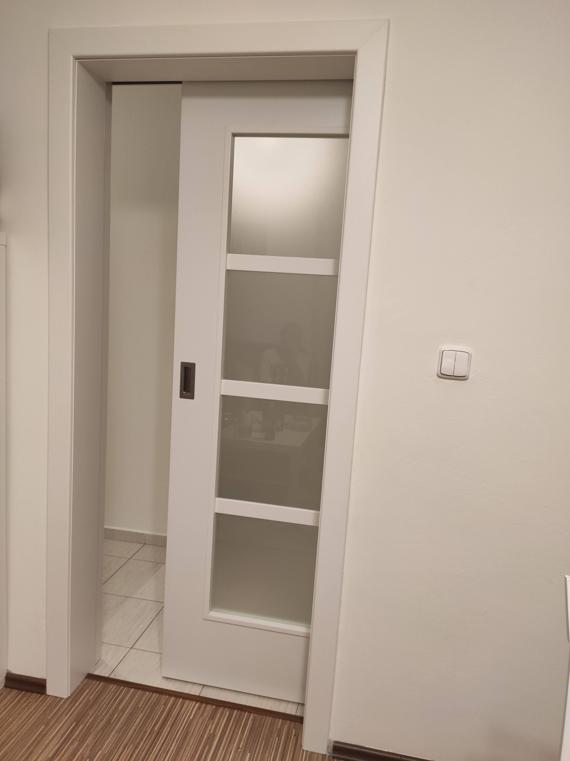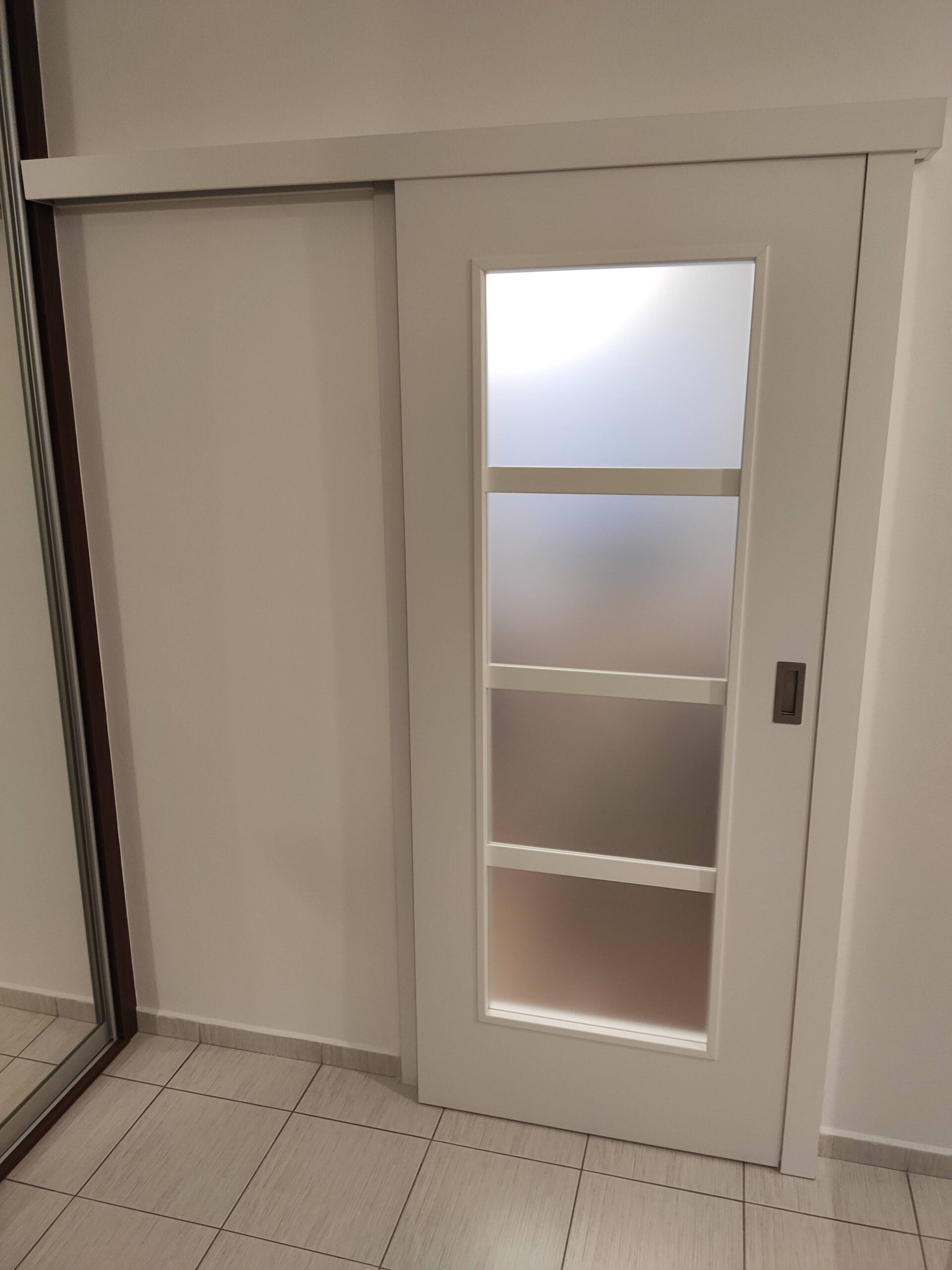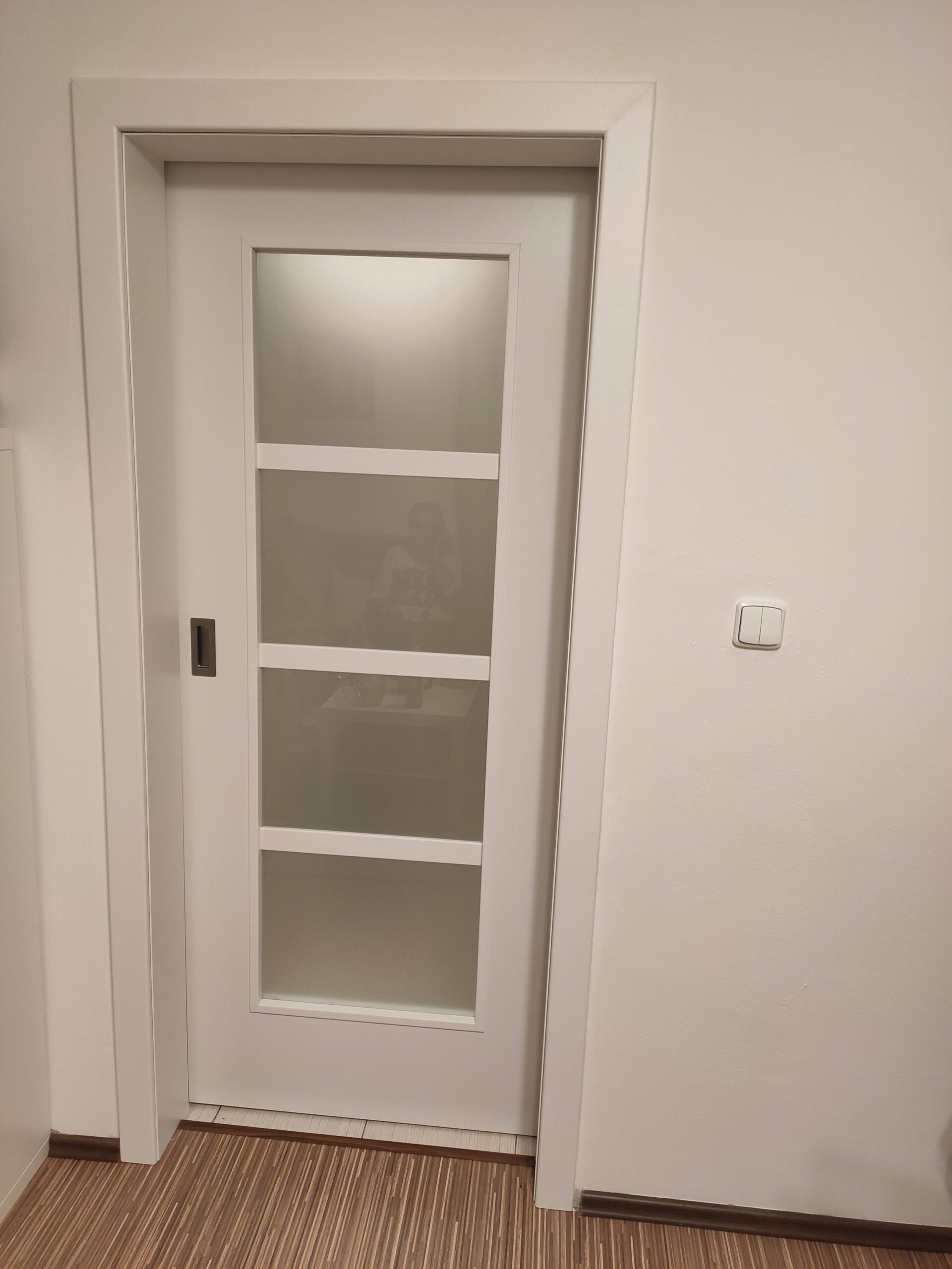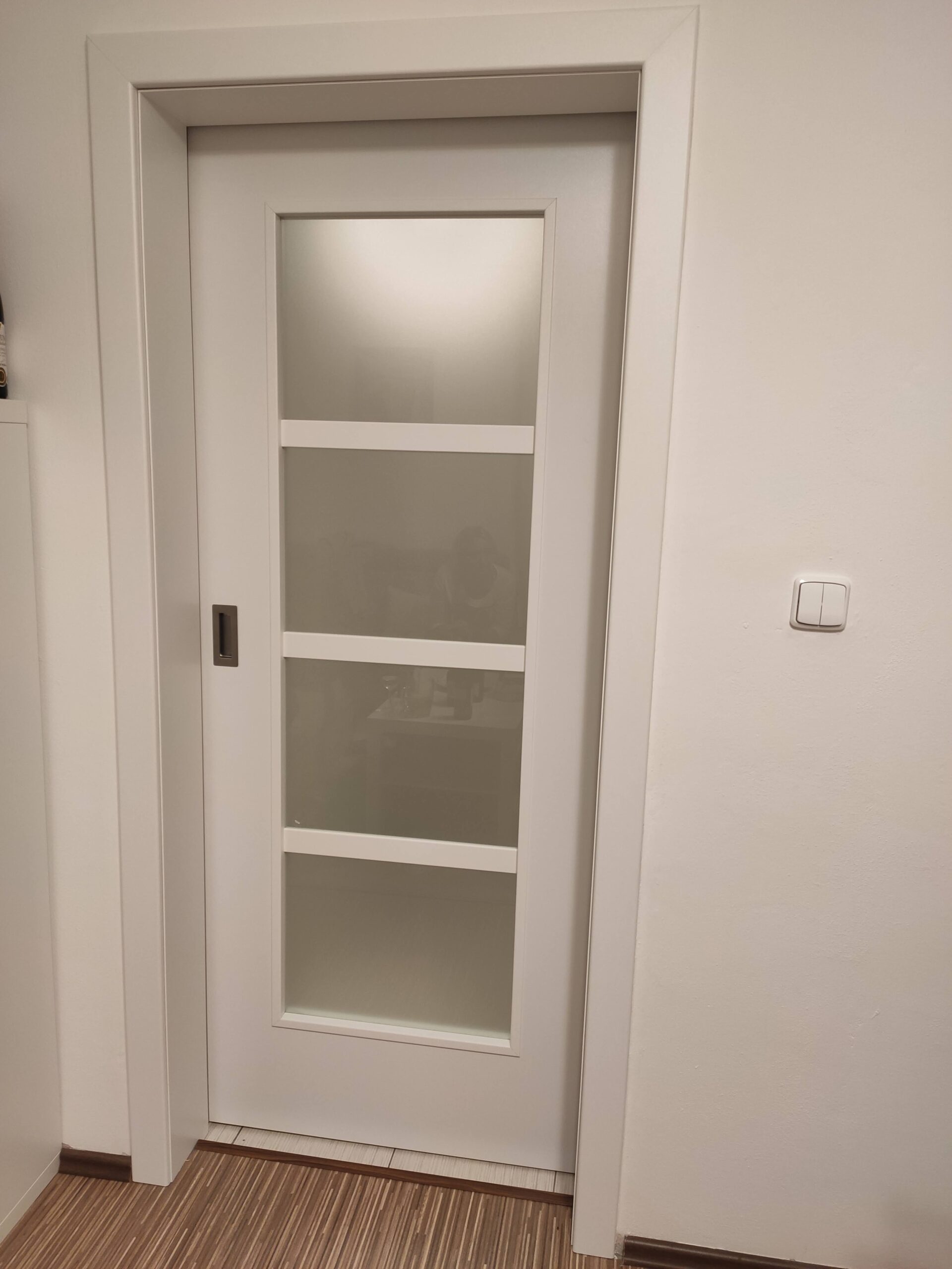 Posuvné dveře na stěnu, částečně prosklené, se sloupkem od výrobce Sapeli.